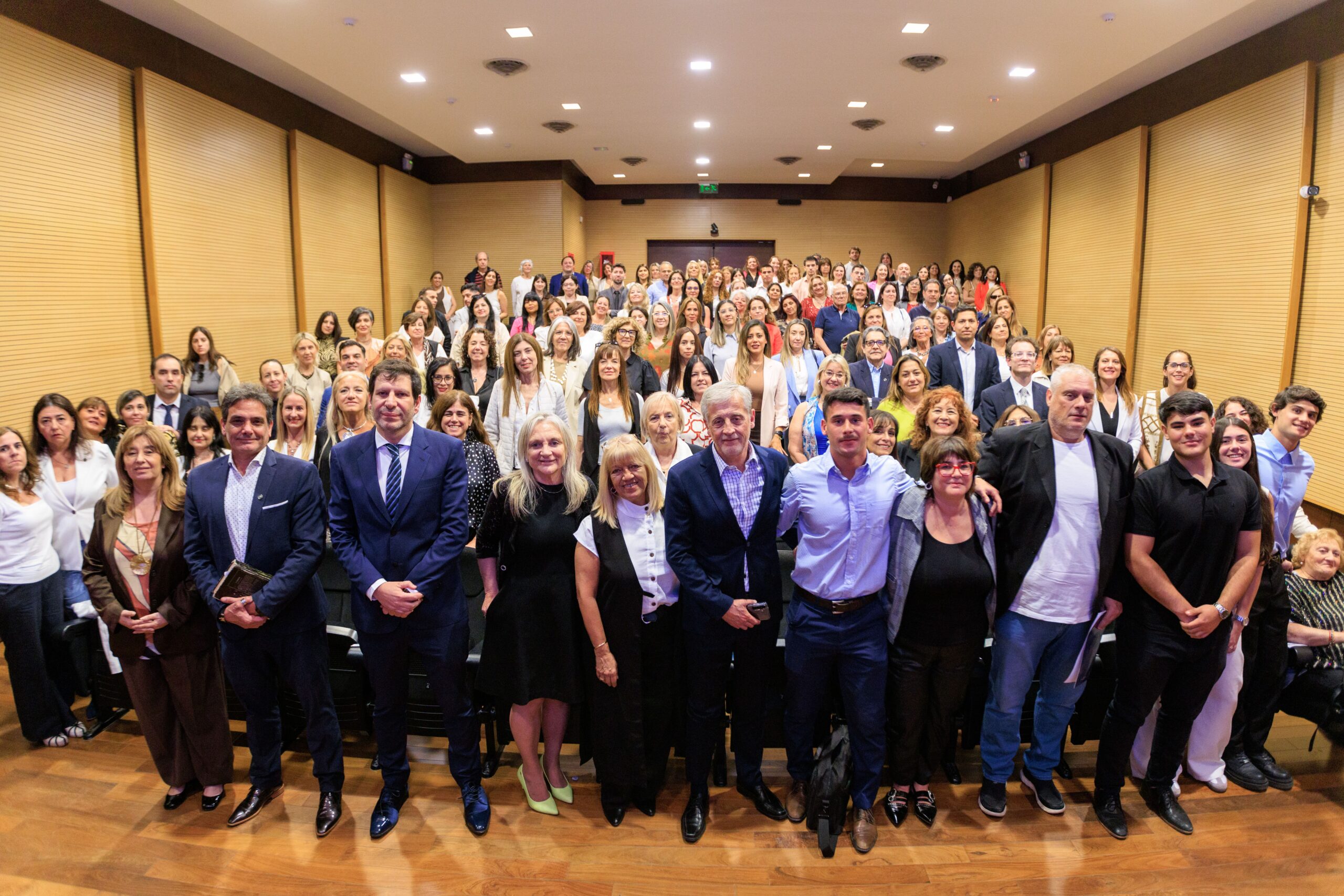 En el tramo final del acto, la familia de la Dra. Lloveras, encabezada por su hija Valeria Durán junto a su esposo Javier Kaplan y sus hijos Ivo, Gastón, Sol y Boris Kaplan, recibió de manos del presidente del Colegio, Dr. Eduardo Bittar, y de la presidenta de la Fundación Simiente, Dra. Tula Cuello, la copia original de la Resolución N.º 37.082 que establece oficialmente esta fecha.