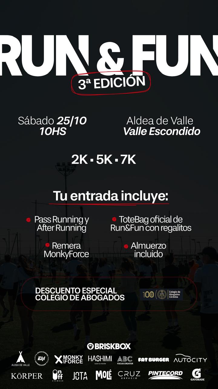 Quienes deseen participar de la 3ª edición del Run & Fun el próximo sábado 25 de octubre a las 10 hs en Aldea de Valle – Valle Escondido, contarán con un descuento especial exclusivo para el Colegio de Abogados de Córdoba.