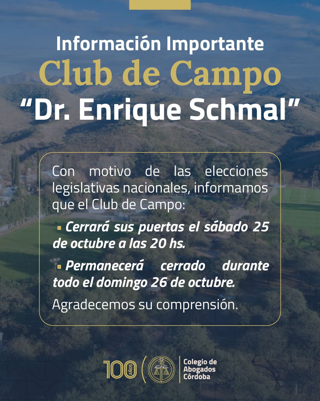 Con motivo de las elecciones legislativas nacionales, informamos que el Club de Campo “Dr. Enrique Schmal”: